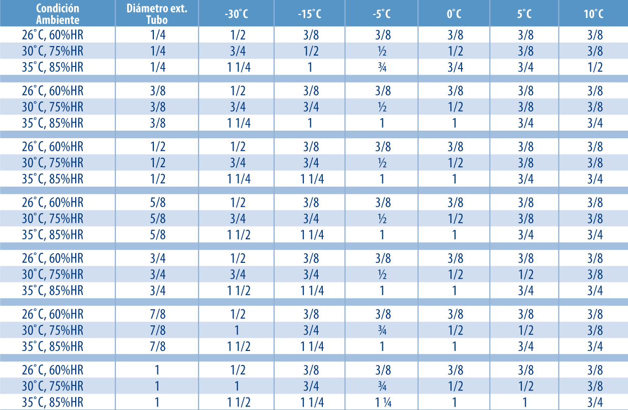 • La tabla muestra la selección del espesor de pared según las condiciones escogidas.