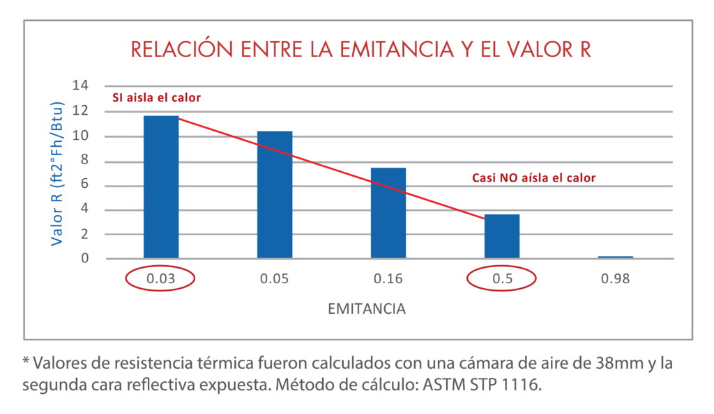 En los aislantes reflectivos, la baja emitancia es sinónimo de un buen desempeño térmico lo que en transferencia de calor se conoce como un valor de resistencia térmica.