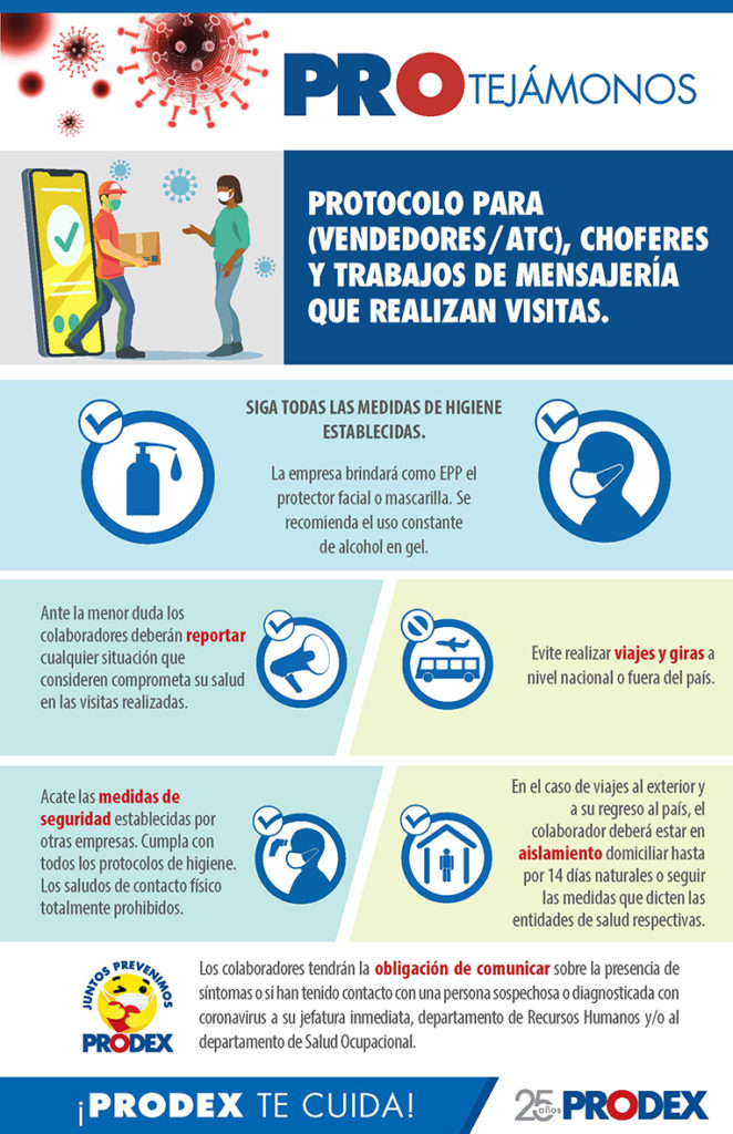 Cada protocolo se presentará de manera gráfica y estratégicamente en las plantas y oficinas de PRODEX a fin de informar y recordar sobre su importancia y aplicación. Detener este virus depende de las acciones individuales, en busca de un bien común.