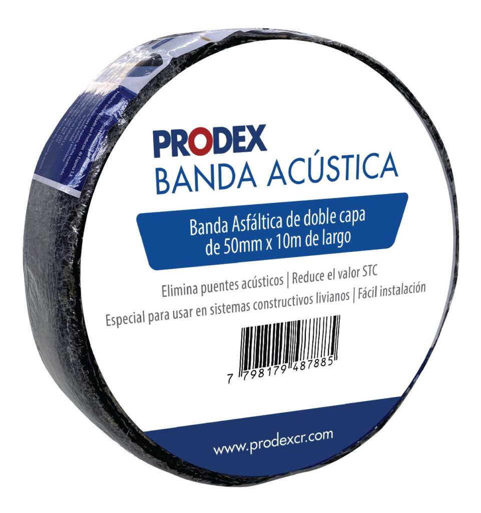 La banda acústica de Prodex es una banda de bitumen o asfalto modificado de alto desempeño y una espuma de celda cerrada que permite generar bloqueo al paso de ondas y vibraciones entre superficies, esto permite que los aislantes acústicos maximicen su desempeño y se traduce en un mayor STC por ensamble.