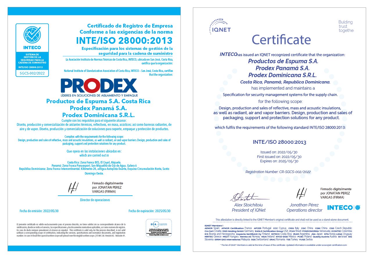 Con la norma ISO 28000: 2013 PRODEX se asegura blindarse con información y evidencia de que el producto sale y llega en perfectas condiciones, además de pasar por procesos limpios y transparentes. Sin importar de cuál planta venga el producto (ya sea de Panamá, República Dominicana, Costa Rica) esta norma siempre va a garantizar seguridad y calidad en los productos.